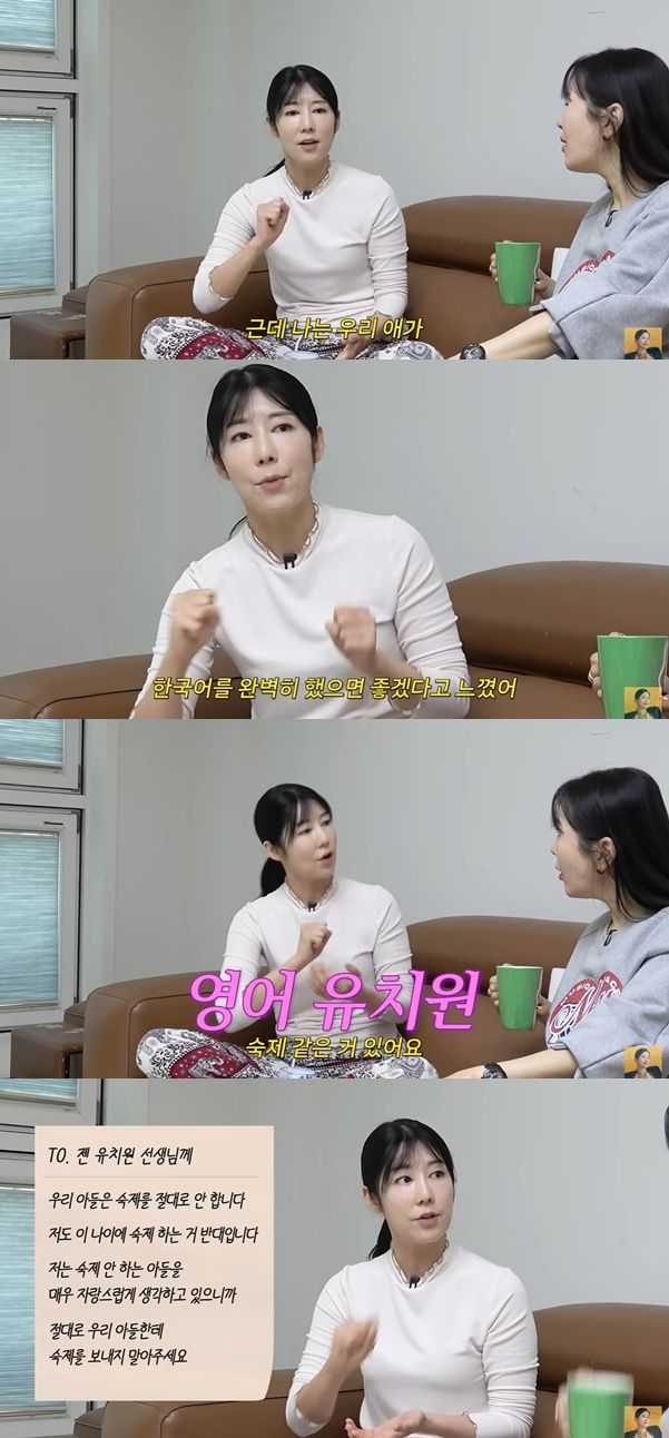 그는 "영어 유치원 숙제가 있다. 숙제는 제가 선생님한테 '우리 아들은 숙제를 절대 안 한다. 저도 이 나이에 숙제 하는 건 반대다. 숙제 안 하는 아들을 매우 자랑스럽게 생각하고 있으니까 절대로 울우리 아들한테 숙제를 보내지 말라'고 편지 썼다"고 이야기했다.