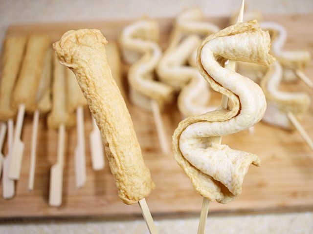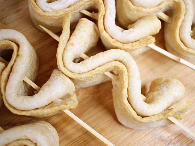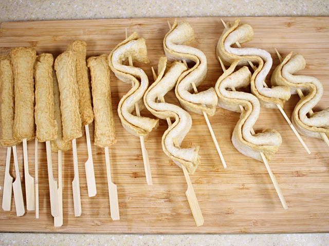 길쭉한 꼬치에 어묵을 끼워요.