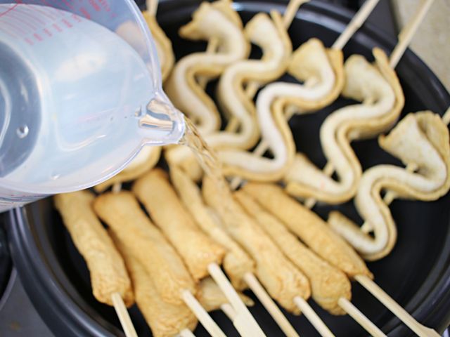 전골냄비에 어묵 꼬치를 넣고