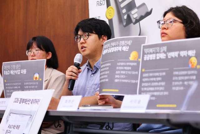 신민기 '카이스트 입틀막 대응 재학생·졸업생 대책위원회 공동대표는 26일 서울 종로 참여연대에서 열린 '윤석열 정부 예산삭감 사례 발표 및 2026 정부예산안 확대 요구' 기자회견에서 이같이 밝혔다. 신 대표는 지난해 2월 카이스트 학위수여식에 참석한 윤석열 전 대통령에게 "R&D 예산을 복원하시라"고 외치다 끌려나갔던 이다.