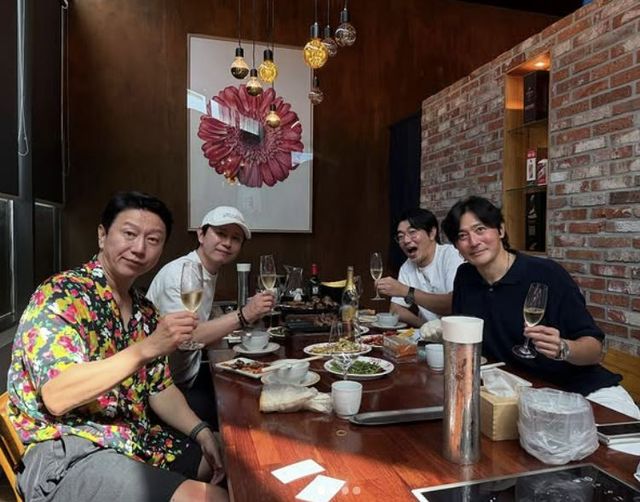 사진 속에는 2012년 방송됐던 드라마 ‘신사의 품격’ 주인공 장동건, 김민종, 이종혁의 모습이 담겨있다. 이들은 샴페인 잔을 하나씩 들고 행복한 미소를 짓고 있다.