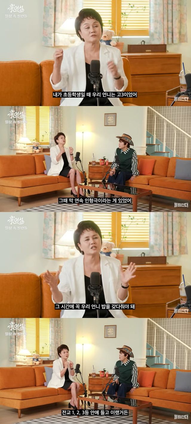 그는 "내가 초등학생일 때 우리 언니는 고3이었다. 그때 연속 인형극이라는 게 있었다. 6시 몇 분에. 그 시간에 꼭 우리 언니 밥을 갖다줘야 했다"며 "나는 고3 되면 누가 그렇게 집에서 한 따뜻한 밥을 갖다주는 줄 알았다"고 말문을 열었다.