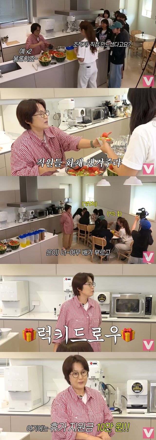 그는 "지금 여러분들을 위한 럭키드로우를 준비했다"면서 "여기에는 휴가 지원금 10만 원"이라며 상품을 소개했고, 송은이의 센스 있는 선물에 들은 직원들은 환호성을 질렀다.