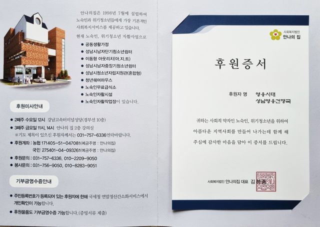 기부처인 안나의 집은 성남시에 위치한 사회복지법인으로, 35년 전 이탈리아에서 귀화한 김하종 신부가 설립했다. 1998년부터 이어져 온 무료급식소에서는 매일 500여 명 이상의 노숙인과 홀몸노인에게 식사를 제공하고 있다. 이외에도 요일별 무료진료와 상담, 이미용, 음악 연주 프로그램을 운영하며 생활·의료·취업 지원을 펼치고 있다. 또한 성남시로부터 위탁받아 위기 청소년을 위한 청소년쉼터와 공동생활가정도 운영하고 있다.