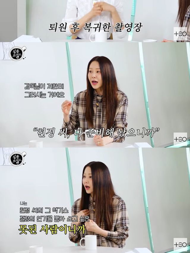 그는 "감독님이 저한테 그러시더라. '현정 씨, 다 준비해 놨으니까 아픈데 괜찮다고 하지 말고 다 말해라. (나는) 현정 씨의 그 액기스, 절정의 연기를 뽑아 쓰고 싶은 못된 사람이니까 배려하지 말고' 그 말씀을 저한테 해주시는데 그런 말을 처음 들어봤다"며 감동 받은 순간을 회상했다.