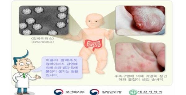 수족구병은 장바이러스(엔테로바이러스)로 인해 발생하는 급성바이러스성 질환으로 환자의 대변 또는 침, 가래, 콧물, 수포의 진물 등과 같은 분비물과 직접 접촉하거나 이런 것에 오염된 물건 등을 만지는 경우 전파된다.
