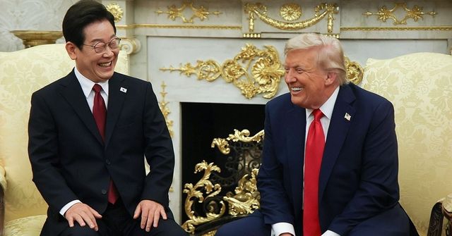 이재명 대통령이 25일(현지 시각) 미국 워싱턴 DC 백악관 오벌오피스에서 도널드 트럼프 미국 대통령과 한미 정상회담을 하며 함께 웃고 있다. / 연합뉴스