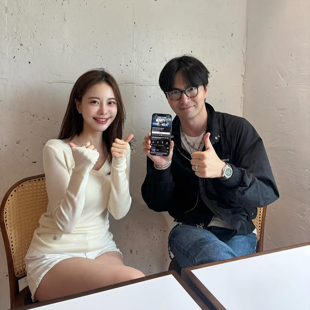 공개된 사진 속 아옳이는 환한 미소로 엄지를 치켜든 모습. 옆에는 배우 이진욱이 휴대폰 화면을 내보이며 같은 포즈를 취해 눈길을 끌었다. 아옳이는 연노랑 니트와 화이트 팬츠로 청량한 분위기를 이진욱은 블랙 재킷과 청바지로 내추럴한 멋을 더했다.