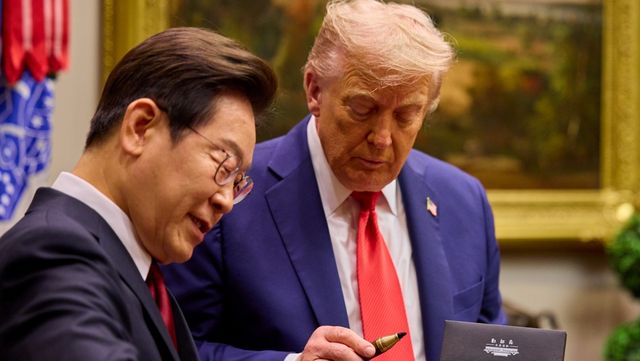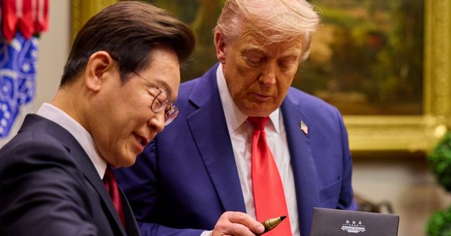 이재명 대통령이 미국 워싱턴DC 백악관에서 열린 한미 정상회담에서 도널드 트럼프 미국 대통령에게 방명록 작성 때 쓴 만년필을 선물하고 있다. / 연합뉴스