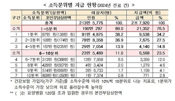 작년 기준 환급대상자의 소득분위를 보면 소득하위 50% 이하 대상자와 지급액이 각각 190만287명, 2조1352억원이다. 이는 전체 대상자의 89%, 지급액의 76.5%를 차지하는 것으로 소득 하위계층의 의료비 부담을 덜어주는 효과가 있다는 평가다.