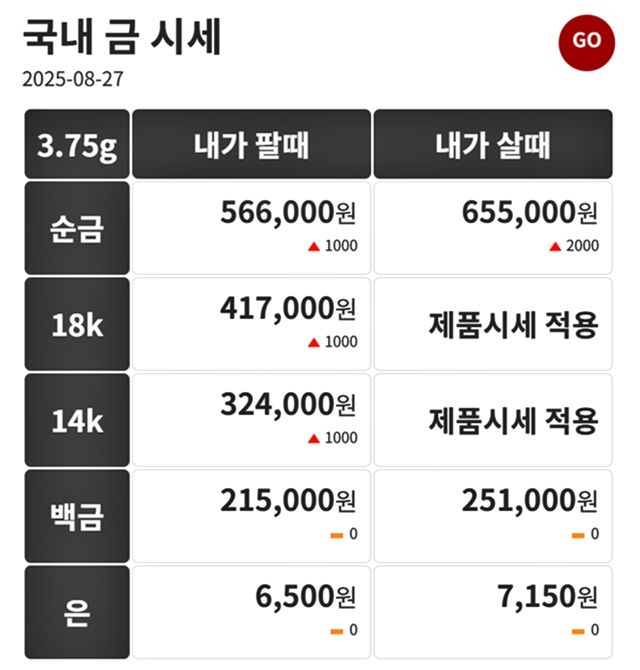 순금(24K) : 매입가 65만 5000원 / 매도가 56만 6000원