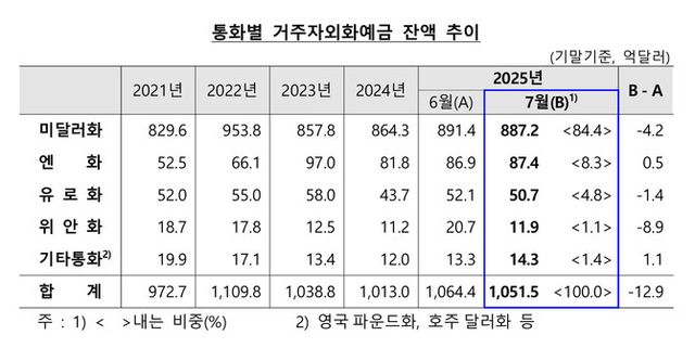 27일 한국은행(이하 한은)이 발표한 '7월 중 거주자 외화예금 동향'에 따르면 지난달 말 외국환은행의 거주자 외화예금 잔액은 1051억5000만달러로 전월 대비 12억9000만달러 줄었다. 지난 5월부터 증가세를 보이다 7월 하락 전환됐다.