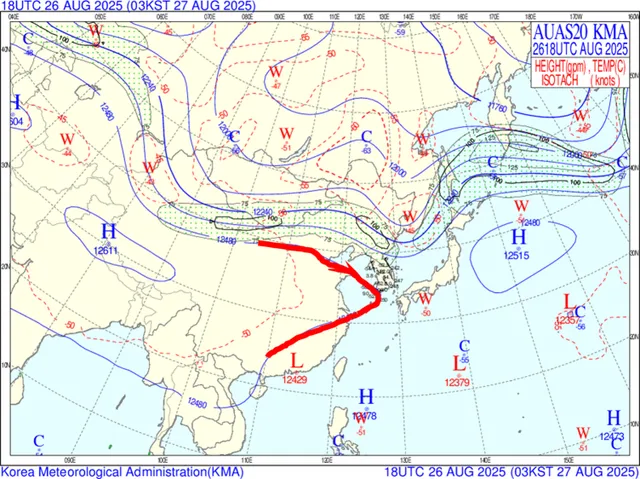 이거 경계선은 상층 제트 경계선인 12480gpm선을 찾으면 되고, 여기서는 저렇게 빨갛게 쳐 놓은 영역이 지금의 티베트 고기압 동쪽 경계부에 해당함