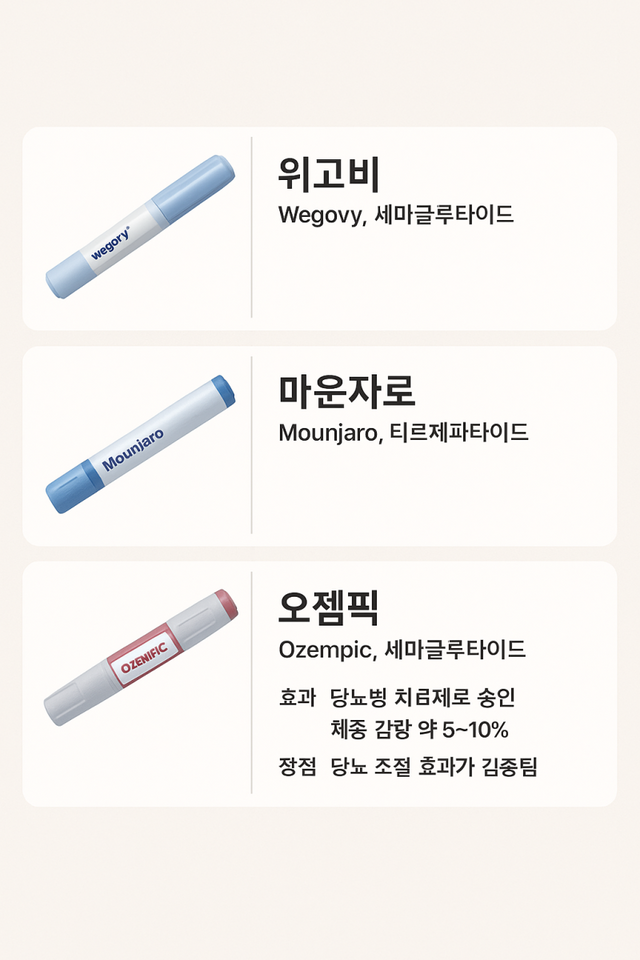 👉 비만만 있다면 위고비, 당뇨가 함께 있다면 오젬픽, 체중 감량 효과를 최대로 원한다면 마운자로를 고려할 수 있습니다.