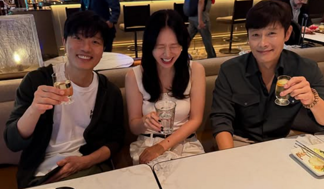 사진 속 손예진은 영화 '어쩔수가없다'(감독 박찬욱)에 함께 출연한 배우 이병헌, 박희순과 공항 라운지에서 즐거운 시간을 보내고 있다.