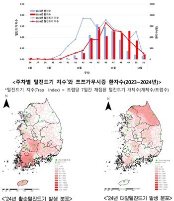 2024년도 감시 결과, 주로 남부 지역에서는 활순털진드기, 중부 및 북부 지역에서는 대잎털진드기가 많이 발생하는 것으로 확인됐다.