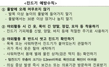 질병관리청이 제시한 진드기 예방수칙은 △풀밭에 오래 머무르지 않기 △야외활동 시 긴 옷, 목이 긴 양말, 장갑, 모자 등 착용하기 △야외활동 후 반드시 씻고 진드기 확인하기 등이다.