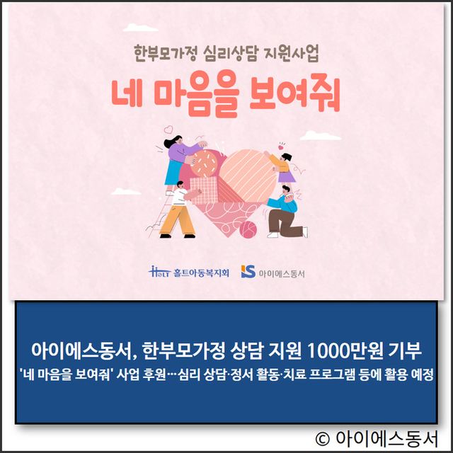 아이에스동서(IS동서)가 한부모가정 심리 상담 지원 사업 '네 마음을 보여줘' 후원을 위해 홀트아동복지회에 기부금 1000만원을 기탁했다.
