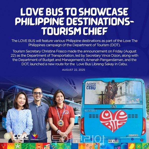 [투어코리아=조성란 기자] 필리핀 관광부는 필리핀의 다양한 관광지를 소개하는 '러브 버스(LOVE BUS)'를 지난 22일 개통했다고 밝혔다.