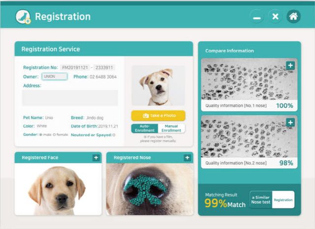 이번에 지정된 AI 코촬영 반려동물 등록 서비스(유니온바이오메트릭스)는 반려동물의 코 무늬를 사진으로 찍어 등록·조회하는 방식이다. 사람마다 지문이 다르듯, 동물마다 코 주름 패턴이 달라 일종의 ‘신분증’ 역할을 한다.