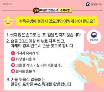 임승관 질병관리청장은 “수족구병 예방을 위해서 손씻기 및 철저한 환경관리 등 예방수칙을 준수하는 것이 중요하다”며, “영유아 보육시설에서는 수족구병에 걸린 경우 완전히 회복한 후 등원할 수 있도록 안내해 달라”고 당부했다.