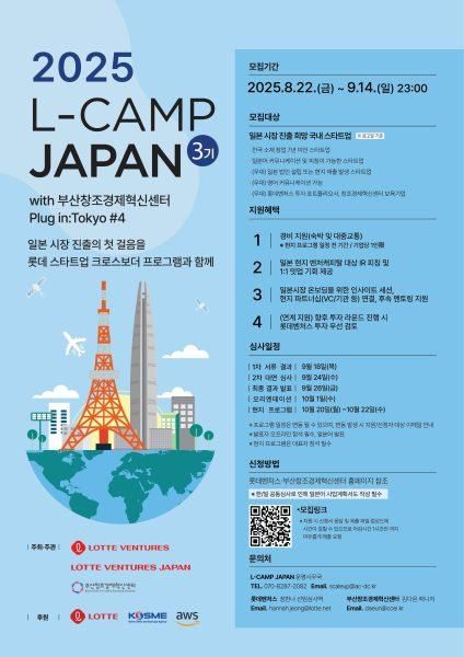 롯데벤처스(대표 김승욱)가 롯데벤처스재팬, 부산창조경제혁신센터와 공동으로 국내 유망 스타트업의 일본 시장 진출을 지원하는 'L-CAMP JAPAN' 3기 참여 기업을 모집한다고 22일 밝혔다.