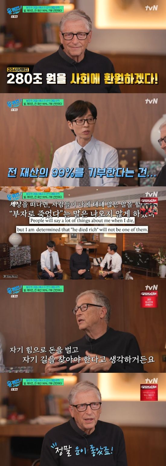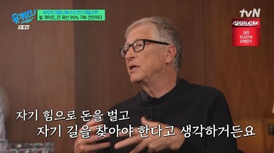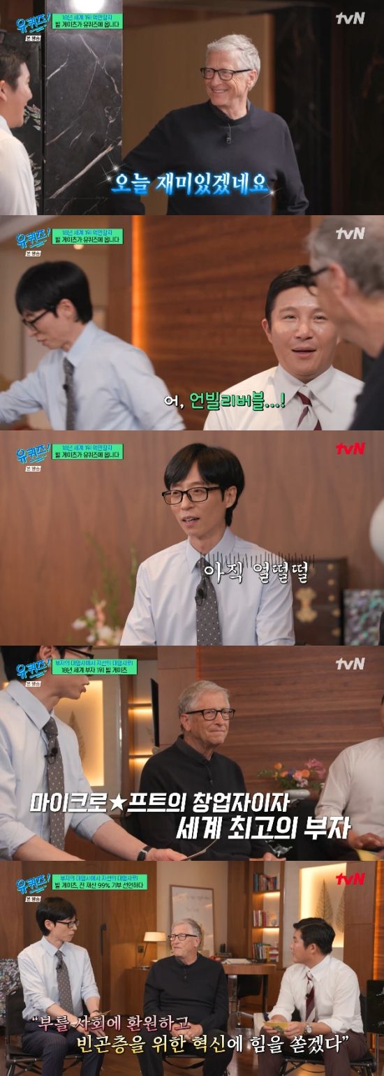 27일 방송된 tvN 예능 프로그램 '유퀴즈 온 더 블럭'(이하 '유퀴즈')에서는 마이크로소프트(MS) 공동창업자이자 게이츠 재단 이사장인 빌 게이츠(Bill Gates)가 출연해 이야기를 나눴다.