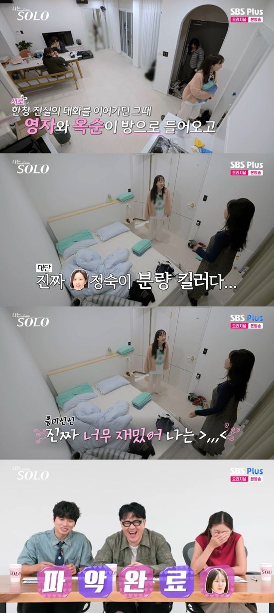 이날 방송에서 정숙이 영철과 장시간 대화를 나누던 중 영자와 옥순이 방으로 들어왔다. 두 사람이 안 보이는 곳으로 자리를 피한 두 사람은 놀랐다. 특히 영자는 "진짜 정숙이 분량 킬러다"라고 감탄했다.