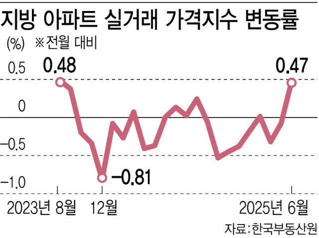 27일 한국부동산원이 최근 발간한 공동주택 실거래가격지수 보고서에 따르면 6월 기준 지방 아파트 매매 실거래가격지수 변동률(전월 대비)은 0.47%로 이는 2023년 8월 0.48% 상승한 이후 1년 10개월 만에 가장 큰 폭으로 오른 수치다.
