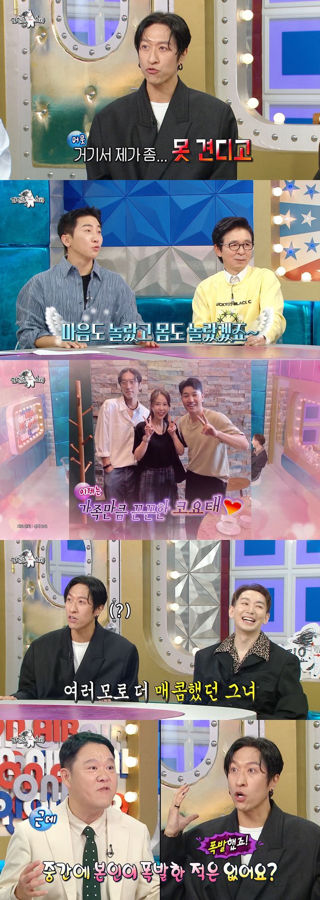 코요태의 특별한 우정도 언급했다. "저는 코요태의 중재를 맡고 있다"는 그는 "옛날에 진짜 많이 싸웠다. 신지 성격 장난 아니지 않나. 밥 뭐 먹을래 이런 것부터 시작해서 말도 안 되는 걸로 싸웠다. 코요태가 없으면 저 뭐 먹고 사냐. 해체할까봐 계속 말리는 거다. 양쪽에서 박쥐처럼 신지한테는 종민이 형 욕을 하고, 종민이 형한테는 신지 욕을 했다"고 팀 유지를 위해 남다른 노력을 기울였다고 밝혔다.