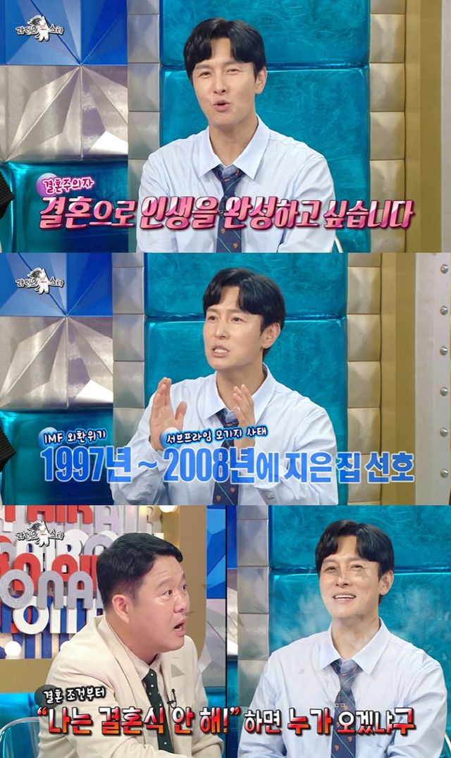 이어 “아예 결혼식을 안 하고 정화수 떠놓고 하고 싶다”고 덧붙였다. 이를 듣던 김구라는 “정화수 같은 소리를 하고 있다”며 “조건 자체를 결혼식부터 안 하겠다고 하면 어느 여자가 오겠나”라고 답답해했다.
