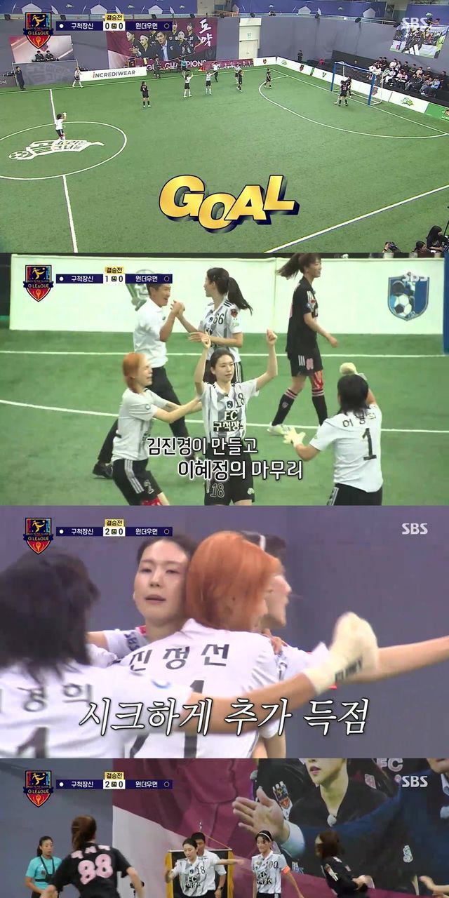 이날 방송에서는 ‘FC구척장신’과 ‘FC원더우먼’이 대망의 결승전을 치렀다. 경기 초반은 ‘원더우먼’의 기세가 강했다. 에이스 마시마를 앞세운 공격은 구척장신을 강하게 압박했다. 하지만 전반 6분, 예상 밖의 득점이 터졌다. 김진경의 킥인이 상대 손에 맞고 흐르자, 이혜정이 이를 골로 마무리하며 구척장신이 1대 0으로 앞서갔다. 이어진 전반 12분에는 김진경의 중거리 슈팅이 그대로 골망을 흔들며 순식간에 2대 0까지 격차를 벌렸다.