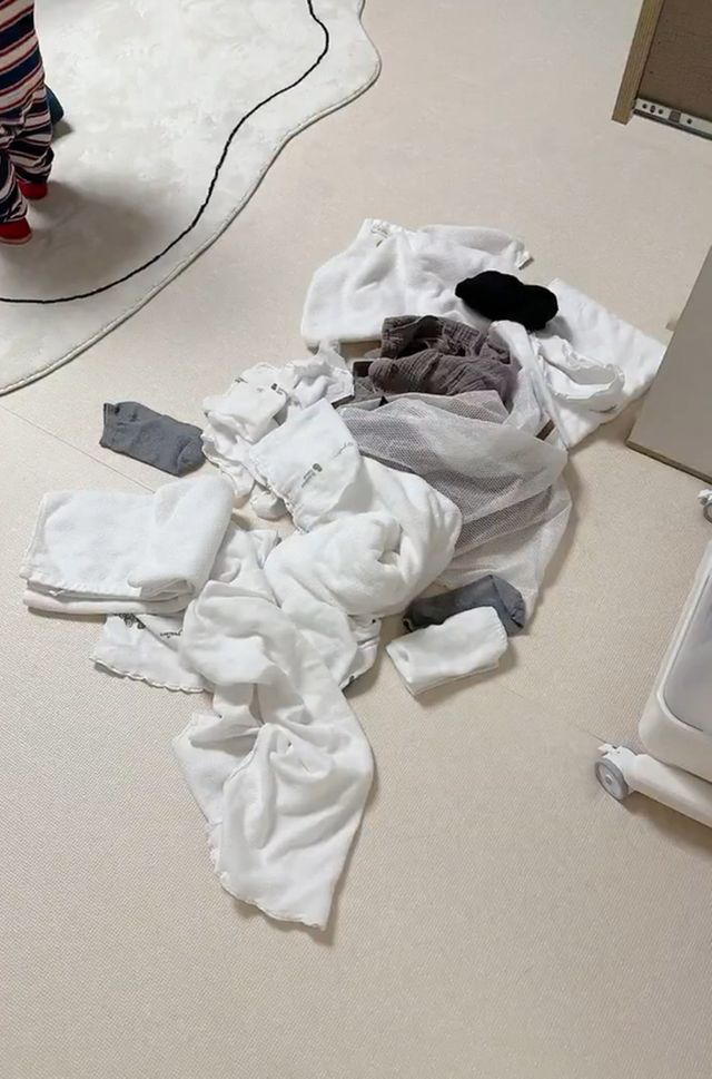 엄마는 "빨래 개는데 서랍에 갖다 놓으려길래 줬더니만 그냥 안방에 다 던져놓음. 그래 놓고 엄청 뿌듯한 표정으로 쳐다봄"이라며 "사랑둥이, 결국 다시 (빨래) 개는 결말"이라고 느낌을 표현했다.