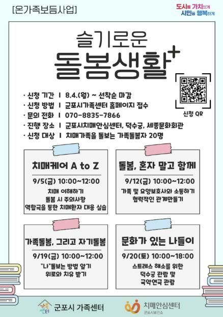 9월 5일부터 매주 금요일, 군포시 치매안심센터에서 진행하며, 주요 내용으로는‘치매 질환 이해와 환자 대응 실습’, ‘가족 및 요양보호사와의 효과적인 소통방법’, ‘돌봄자의 자기 관리와 치유 방법’등으로 구성된다. 특히 마지막 시간에는 문화체험활동으로‘덕수궁 탐방과 국악 연극 관람’을 통한 정서적 휴식을 제공할 예정이다.
