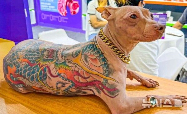 뉴시스 보도에 따르면, 28일 홍콩 사우스차이나모닝포스트에 따르면 지난 22일 열린 '펫페어 아시아'(Pet Fair Asia) 박람회에서 한 관람객이 촬영해 공개한 영상에는 털 없는 개가 등에 화려한 용 문신을 비롯해 온몸에 커다란 색색의 문신이 새긴 모습이 담겼다.