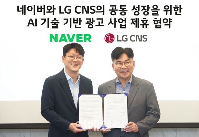 LG CNS는 최근 서울 마곡 LG사이언스파크 본사에서 네이버와 ‘AI 기술 기반 광고 사업 제휴 업무협약(MOU)’을 체결했다고 28일 밝혔다. 협약식에는 LG CNS 엔트루 최문근 전무와 네이버 광고세일즈/파트너십 한재영 전무 등이 참석했다.