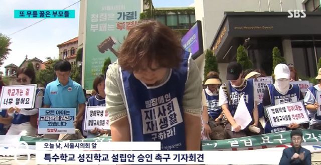 학부모들은 “서울시의회는 성진학교 신설안을 지체 없이 승인하라”, “장애를 갖고 온 우리 어여쁜 아이들에게 설움 주지 말라”며 무릎을 꿇었다. 이날 체감온도는 33도를 오르내렸다.