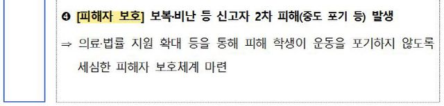 피해자 보호도 두텁게 개선한다. 학생선수 맞춤형 폭력피해 대응 지침(매뉴얼)을 제작·배포하고, 2026년부터는 피해자에 대한 의료·상담·법률 등 지원을 확대(500만 원→1000만 원)한다. 특히 성폭력 피해자의 경우, 해바라기센터 등 각 부처의 피해자 보호 제도와 연계해 보호받을 수 있도록 폭넓게 지원할 예정이다.