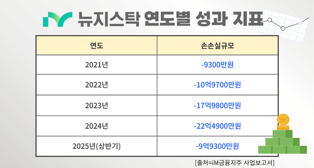 MZ세대를 대상으로 증권 플랫폼 서비스를 제공하는 핀테크 계열사 뉴지스탁도 지난해 22억4900만원의 순손실을 내며 전년 대비 약 5억원 가량 적자 폭이 확대됐다. 뉴지스탁은 2021년 iM금융에 인수된 이후 지금까지 단 한 차례도 흑자를 내지 못했다. 2021년 9300만원의 순손실을 기록한 데 이어 ▲2022년(10억9700만원) ▲2023년(17억9800만원) ▲2024년(22억4900만원) 등 매년 적자 폭이 확대되고 있다. 올해 상반기에도 9억9300만원의 손실을 내며 적자 기조를 이어갔다. 뉴지스탁은 황 회장이 과거 그룹 미래기획총괄 시절 직접 인수를 주도한 계열사다. 황 회장은 디지털 혁신 가속화와 자본시장 경쟁력 강화를 목표로 뉴지스탁을 인수했다. 국내 금융지주 가운데 핀테크 기업을 직접 인수한 첫 사례였다.