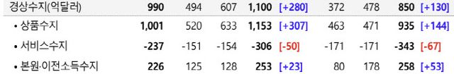 한편, 경상수지는 국가 간 상품, 서비스의 수출입과 함께 자본, 노동 등 모든 경제적 거래를 합산한 통계다. 한 나라의 기초체력을 나타내는 지표로 크게 상품수지, 서비스수지, 본원소득수지, 이전소득수지로 구성된다.
