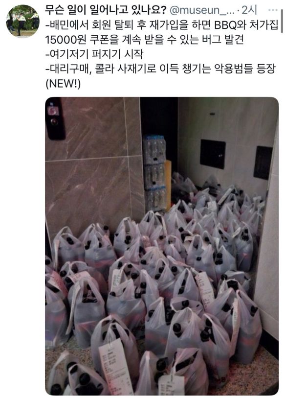 이 쿠폰을 악용해 일부 이용자들이 회원 탈퇴와 신규 가입을 반복, 쿠폰을 무제한으로 생성해 치킨과 콜라를 반복 주문했다는 인증 게시물이 온라인과 SNS에 잇따라 올라온 것이다.