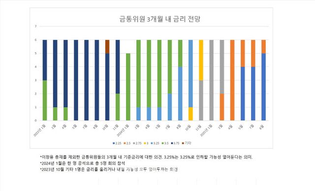 금통위원들의 금리 전망 기간이 올해 마지막 통화정책방향 결정회의인 11월까지를 포함한다는 점도 고려해야 할 부분이다. 박석길 JP모건 이코노미스트는 “5월 금리 인하에 앞서 4월에는 신 위원의 인하 소수의견과 6명의 위원이 3개월 이내 인하 가능성을 인정했다”며 “다음 금리 인하 시점으로 10월을 전망하지만 지연될 가능성도 있다”고 했다.
