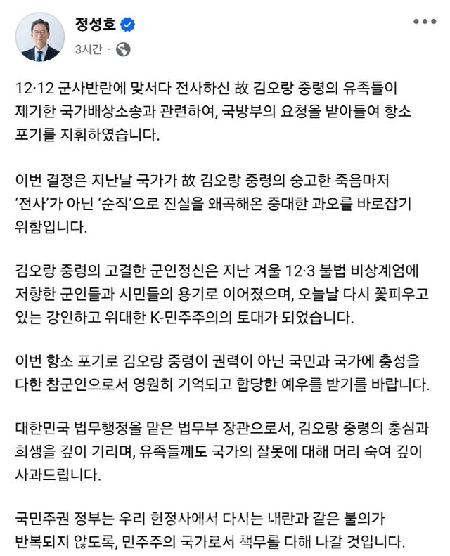정성호 법무부 장관은 28일 페이스북을 통해 “국방부의 요청을 받아들여 항소 포기를 지휘했다”고 밝혔다.
