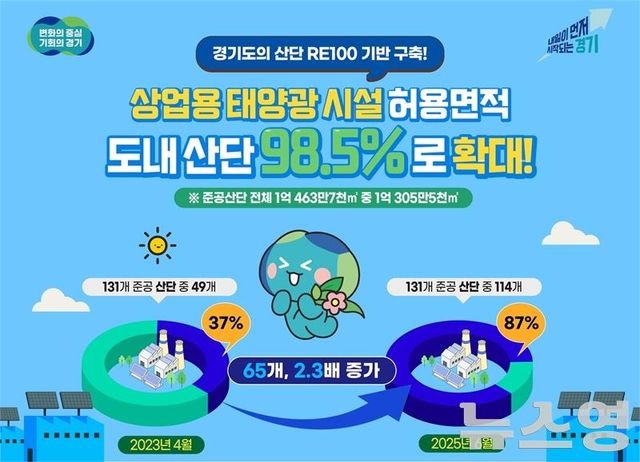 (뉴스영 이현정 기자) 경기도가 김동연 경기도지사의 ‘경기 RE100’비전 선포 이후 2년 만에 산업단지 내 상업용 태양광 재생에너지 시설 설치 허용 면적을 도내 산단의 98.5%까지 확대했다.