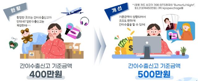 우선 간이 수출신고 금액 기준을 기존 400만원에서 500만원으로 상향해 기업의 신고 부담을 줄여주기로 했다. K팝과 연계된 한정판 굿즈의 가격이 올라가고 있는데, 400만원을 넘어서면 복잡한 일반수출신고 절차를 밟아야 하는 전자상거래 기업의 번거로움을 줄여주기 위한 것이다.
