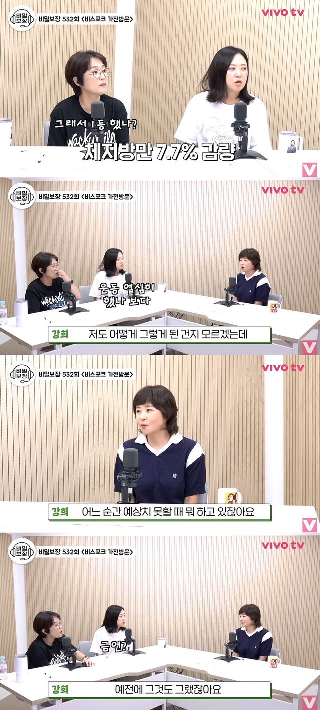 이날 송은이는 게스트로 초대된 최강희에게 "얼마전에 나도 최강희에서 50일 다이어트 챌린지를 했지 않냐. 체지방만 7.7% 감량했다"라고 화두를 던졌다.