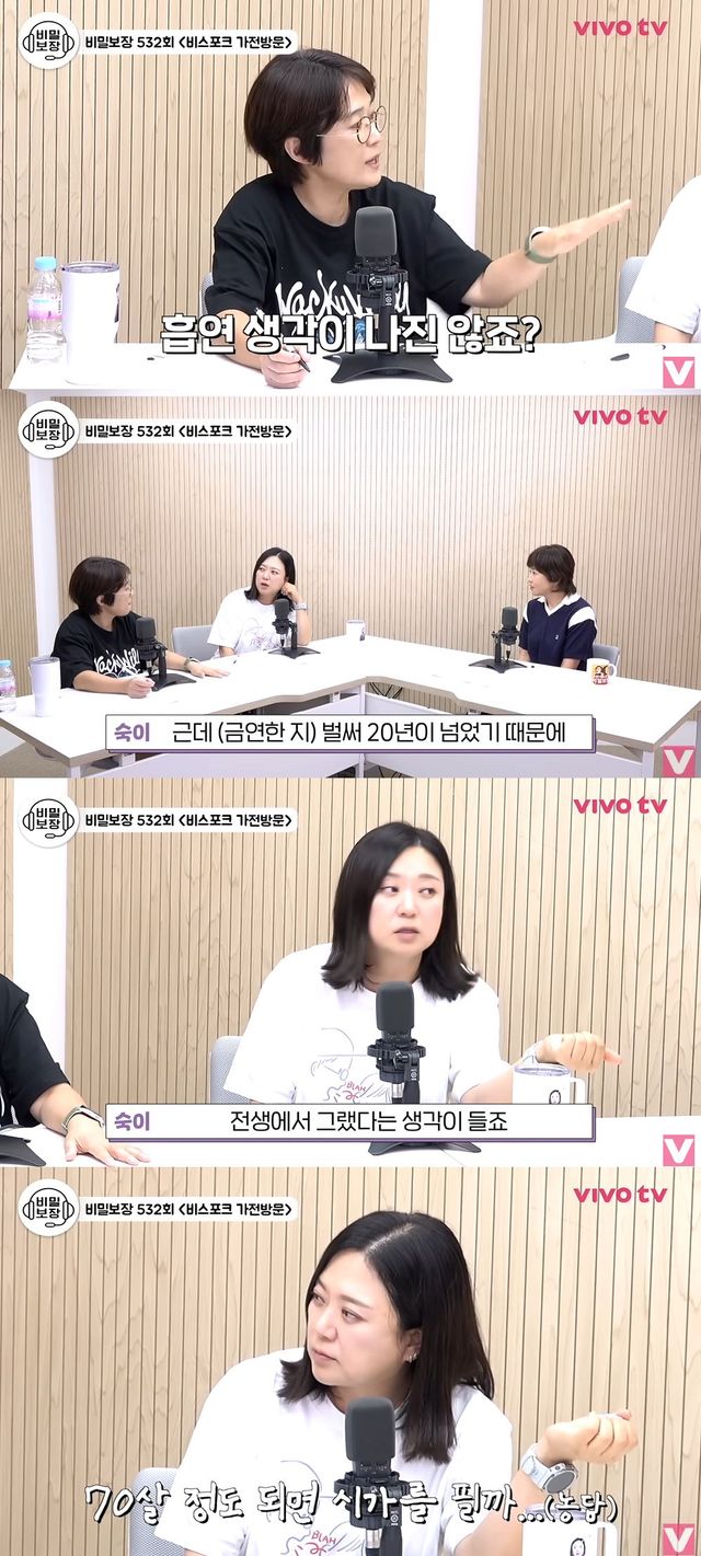 송은이가 "두 분 다 지금 당기지는 않죠?"라고 궁금증을 드러내자, 김숙은 "벌써 20년이 넘었기 때문에 금연한 지가 너무 오래됐다. 폈던 시간보다 안 폈던 시간이 더 많기 때문에 이제는 옛날 옛적 전생에서 그랬다는 생각이 든다"라고 털어놨다.
