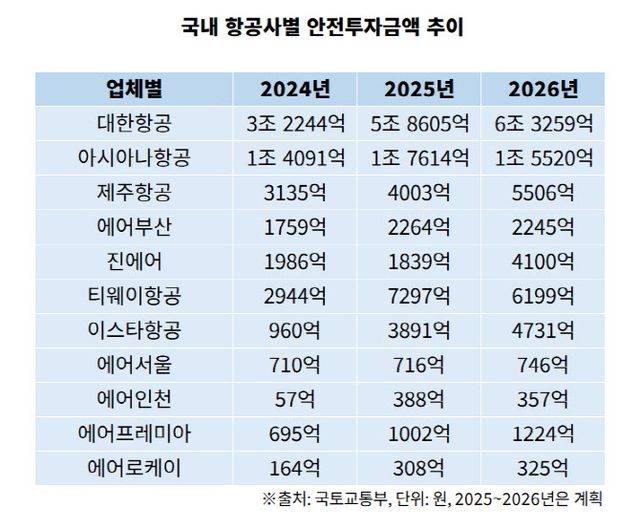 공시에 따르면 항공안전투자 총액은 2022년 4조 2298억원에서 2023년 5조 8445억원으로 38.2% 늘어난 데 이어 3년 연속 증가했다. 국토부는 이 같은 확대 기조가 앞으로도 지속될 것으로 보고 있다. 실제 항공안전 투자 예정액을 보면 올해 9조 7928억원, 2026년 10조 4214억원 등으로 증가 흐름을 보이고 있다.