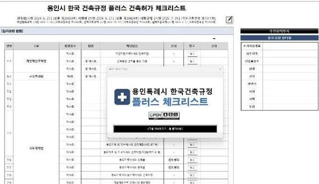 [와이뉴스] 용인특례시는 건축허가 신청 시 필요한 항목만 검토해 제출할 수 있도록 ‘용인시 한국건축규정 플러스 체크리스트’ 프로그램을 자체 제작했다고 1일 밝혔다.