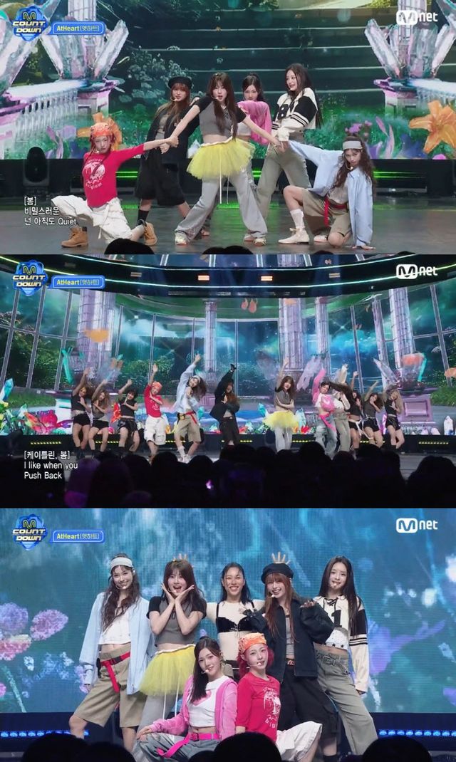 앳하트는 지난 28일 Mnet ‘엠카운트다운’에 출격해 첫 번째 EP ‘플롯 트위스트’(Plot Twist)의 ‘푸시 백’(Push Back) 무대를 음악방송에서 처음 선보였다.